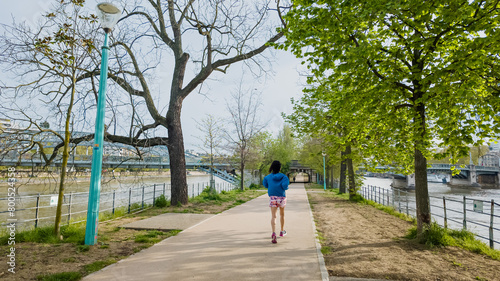 Fototapeta premium Active woman jogging along a scenic river pathway in spring, promoting health...