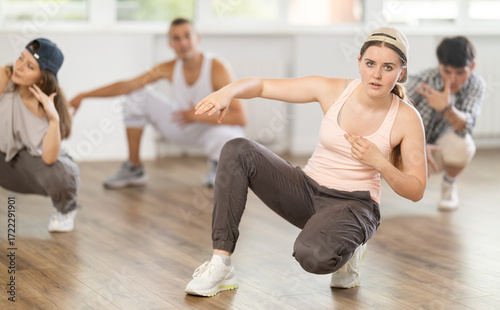 Fototapeta premium Active young girl performing seated pose of breakdance in training hall during dancing classes