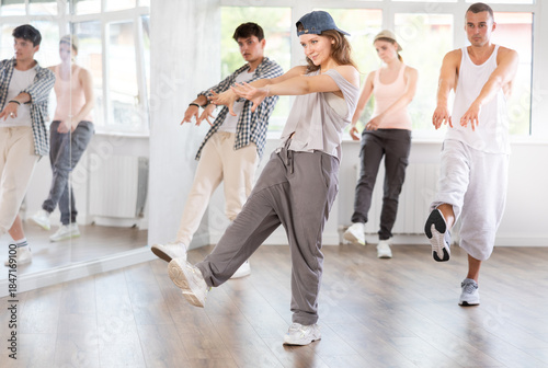 Fototapeta premium Active young girl practicing kicking move of hip-hop in training hall during dancing classes