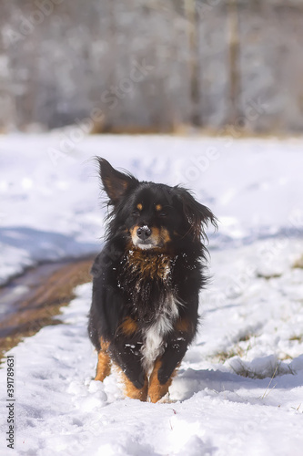 Naklejka premium Active young mongrel dog walks outdoors on the snow in winter