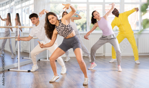 Fototapeta premium Active young woman practicing hip-hop dance in training hall during group dancing classes