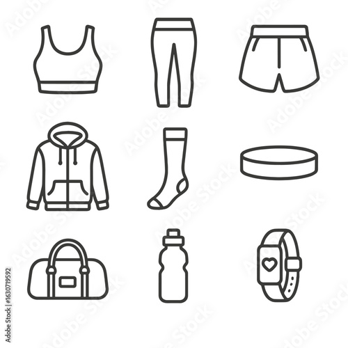 © Valentyna, Fototapeta premium Activewear Line Icons. Line style icons of Activewear Wardrobe: sports bra, yoga legging, running short, hoodie jacket,