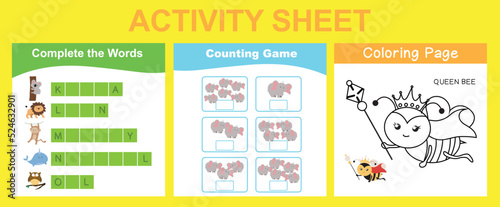 © idcreative.ddid, Fototapeta premium Activity sheet for children. Complete the words, colouring animal, counting worksheet. Educational printable sheet for children. Vector illustration.