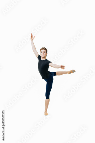 Fototapeta premium Actor Russian ballet,young ballet dancer performing complex elements on a white background