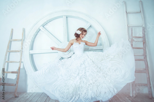 © kudavik, Naklejka premium Actress Liza Arzamasova. Celebrity. Happy Beautiful Bride Girl In Wedding White Dress. Glamour Hairstyle And Makeup.