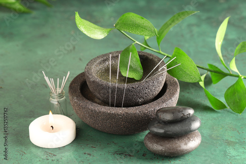 Obraz premium Acupuncture needles, candle and spa stones on green background