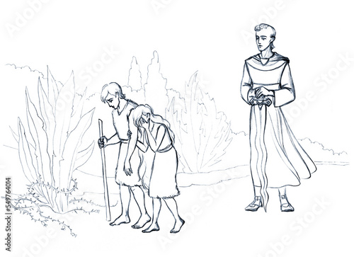 © Marina, Obraz premium Adam and Eve are expelled from paradise. Pencil drawing