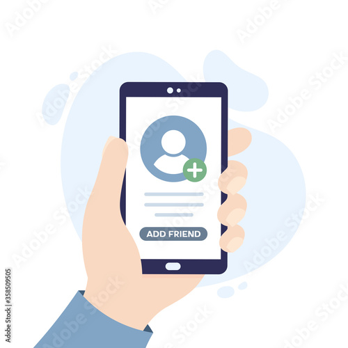 © FRESH TAKE DESIGN, Fototapeta premium Add a friend concept. Hand holding a smartphone.