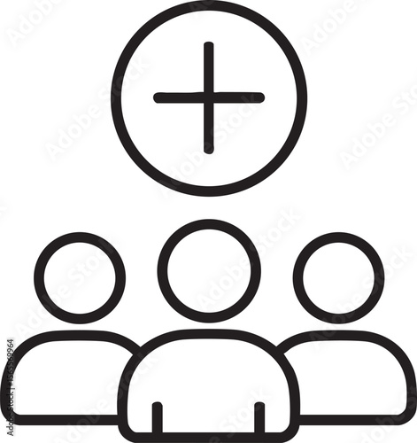 Obraz premium Add New Group Member Icon with Plus Sign Circle Above Three Generic People Outlines in Black