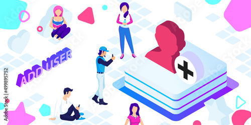 © Petr, Fototapeta premium Add user isometric design icon. Vector web illustration. 3d colorful concept