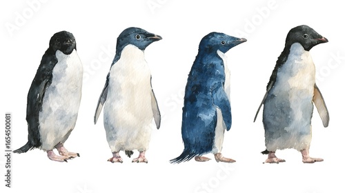 Naklejka premium adelie penguin watercolor illustration set. Hand drawn realistic emperor...