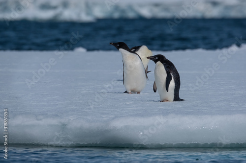 Naklejka premium Adelie penguins on icebergs and icefloats along the coast of the Antarctic Peninsula, Antarctica