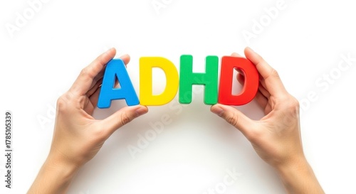 Fototapeta premium ADHD Awareness: Gentle hands carefully present the word ADHD in vibrant, colorful letters, representing understanding and support for those with Attention-Deficit/Hyperactivity Disorder.