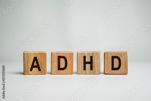 © Dadan, Obraz premium ADHD or attention deficit hyperactivity disorder text letter message on wooden cube isolated on white background