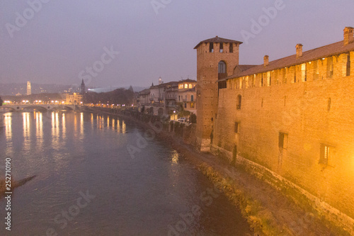 Fototapeta premium Adige River and ancient wall of Castelvecchio at night, Verona, Italy.