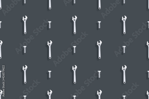 © Zuev Ali, Naklejka premium Adjustable metal wrench seamless pattern. Background from a metal wrench and a bolt.