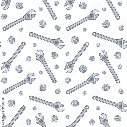 Fototapeta premium Adjustable wrench and screw nut. Seamless pattern with nuts.