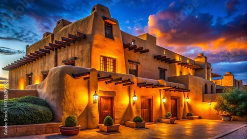 © Four888, Fototapeta premium Adobe Architecture in Santa Fe: Night Photography of Historic Building with Warm Early Morning Light