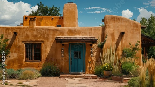 Fototapeta premium Adobe House with Teal Door and Desert Landscaping.