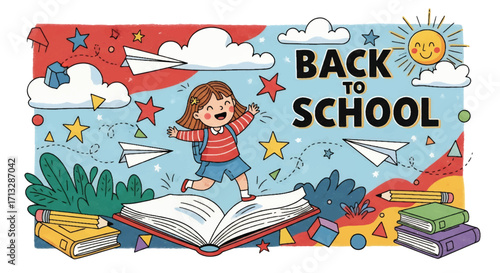 © Amie, Obraz premium Adobe illustrator artwork vector illustration. Two happy children, one holding an "A+" paper and another reading a book, celebrate "Back to School" with educational elements