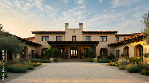 © roei, Obraz premium Adobe Pueblo Revival with Traditional Vigas and Mountain Views, Santa Fe Desert Estate Architecture