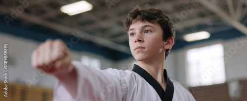 © ckybe, Obraz premium Adolescent hones rapid taekwondo strikes during morning practice sessions.