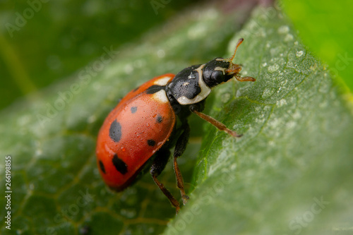 Fototapeta premium Adonia Variegata red ladybug posing on green leaf