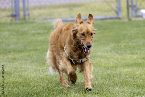 Naklejka premium adorable, adult, animal, background, barking dog, beautiful, breed, canine, close-up, cute, field, forward, friendly, fun, funny, golden, golden retriever, grass, green grass, happy, healthy, joy, lab