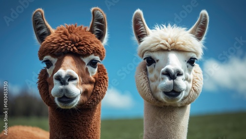 © -Quantum Pixels-, Obraz premium Adorable Alpaca heads with brown and cream fur against a blue sky, close-up shot with muzzles facing the camera, horizontal orientation, high-quality image