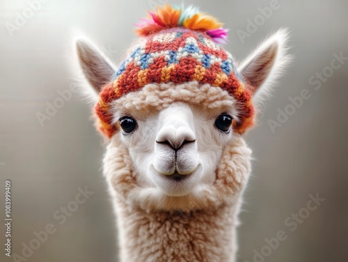 © Bipul Kumar, Fototapeta premium adorable alpaca wearing a colorful knitted hat