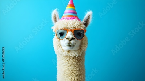 Fototapeta premium Adorable Alpaca Wearing Sunglasses and Party Hat Fun Festive Animal Portrait Blue Background Happy Birthday Celebration Cute Fluffy Cream Alpaca