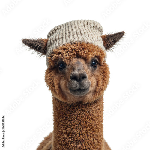 © GMeta, Fototapeta premium Adorable alpaca with brown wool in cozy winter hat against a white backdrop