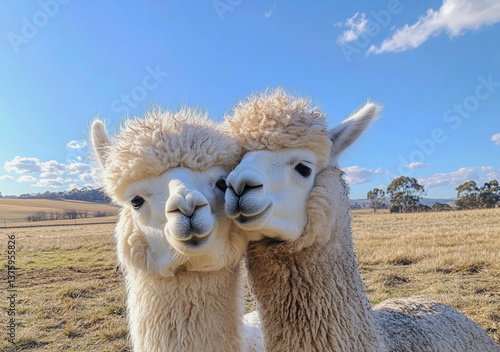 © Ackbara Studio, Obraz premium Adorable alpacas gently touching noses in a sunny meadow at sunset. Heartwarming animal interaction, perfect for concepts of friendship, love, cuteness, and nature bonding.