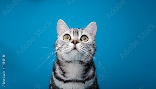 Obraz premium adorable American Shorthair Cat Looking Up on Blue Background