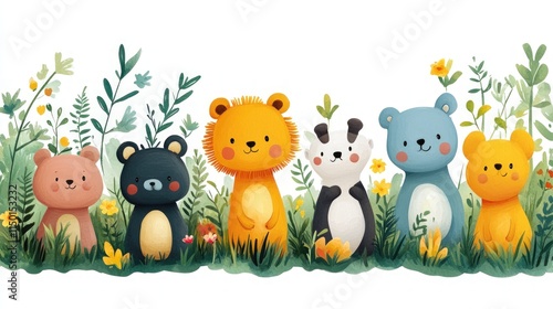 © Ali, Naklejka premium Adorable animal friends in a floral garden.