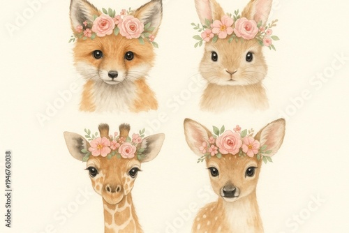 © Rawpixel.com, Fototapeta premium Adorable animals with floral crowns.