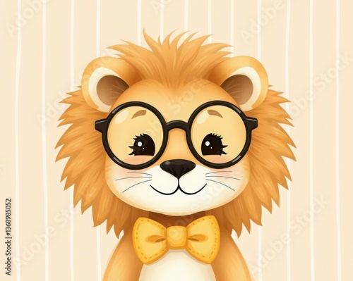 © Renate, Obraz premium Adorable animated lion wearing glasses and a bow tie on a soft background. Ideal for children's illustrations, cartoons, and educational materials, perfect for sparking creativity!