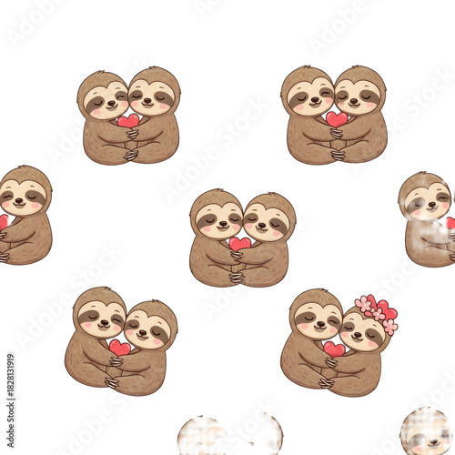 Naklejka premium adorable anthropomorphic baby sloth couples embracing in a dense, seamless...