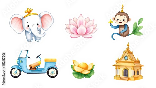 Fototapeta premium Adorable Asian Elephant Monkey Lotus Scooter Temple Illustration