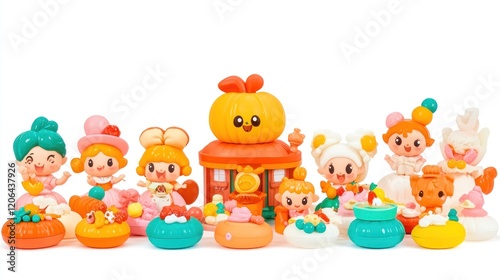 Obraz premium Adorable autumn-themed figurines and miniature bakery set on white background.