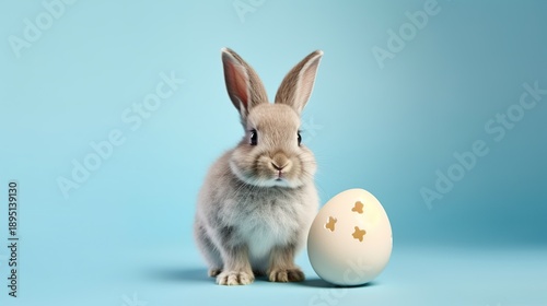 Fototapeta premium Adorable Baby Bunny Posing Beside a Starry Easter Egg in Soft Studio Light