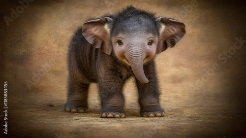 © milenialdesastudio, Naklejka premium Adorable baby elephant calf standing, looking directly at the camera against a textured brown background.