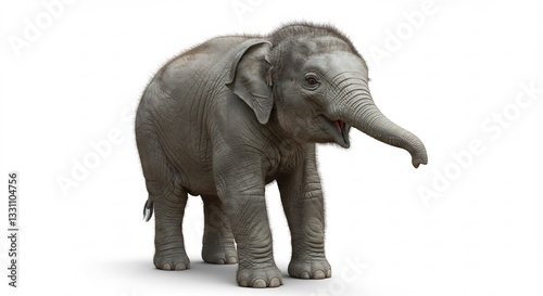 © Duc, Obraz premium Adorable baby elephant playfully stands against bright white background. AI Generated