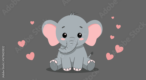 © mrvect02, Obraz premium Adorable baby elephant with big ears and pink hearts floating around it on a grey background