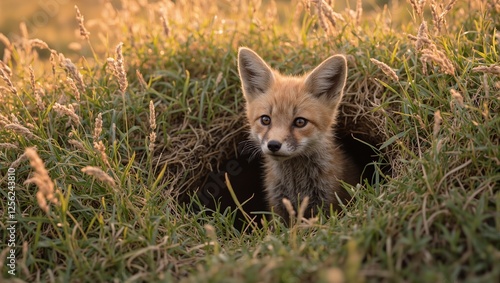 © GMeta, Obraz premium Adorable baby fox kit exploring outside den at sunset with golden light and wild grass