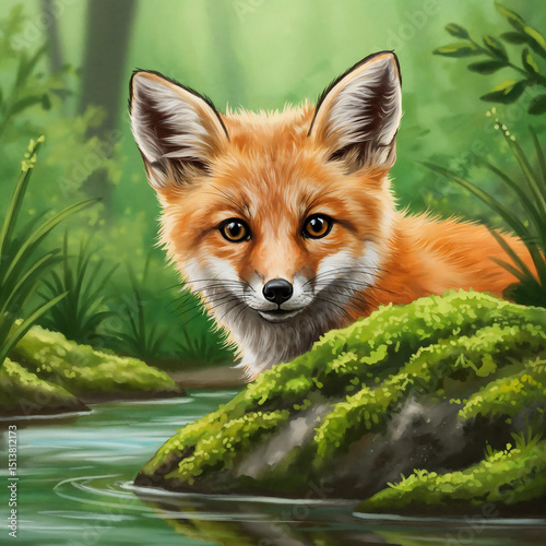 © Sitaram, Fototapeta premium Adorable Baby Fox Peeking – Watercolor Woodland Animal Art