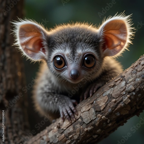 Fototapeta premium Adorable Baby Galago Primate on Branch Large Ears Cute Wildlife