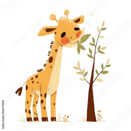 © donchanu, Fototapeta premium Adorable Baby Giraffe Eating Leaves from a Tree in a Meadow Illustration