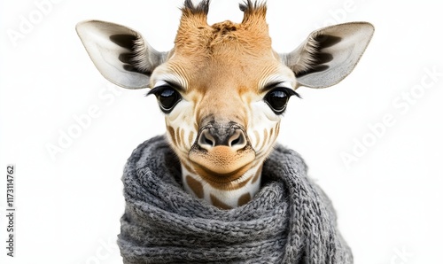 © Maryanto, Naklejka premium Adorable baby giraffe wearing a cozy gray scarf against a white background.