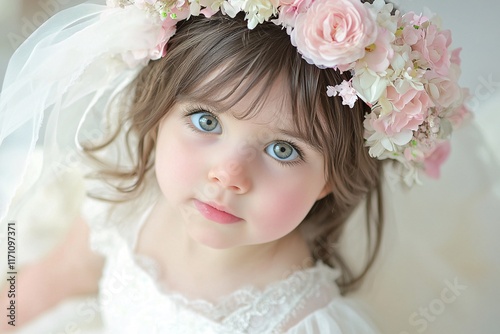 © Guy, Naklejka premium Adorable Baby Girl with Flower Crown Pretty Child Innocence Sweet Beautiful